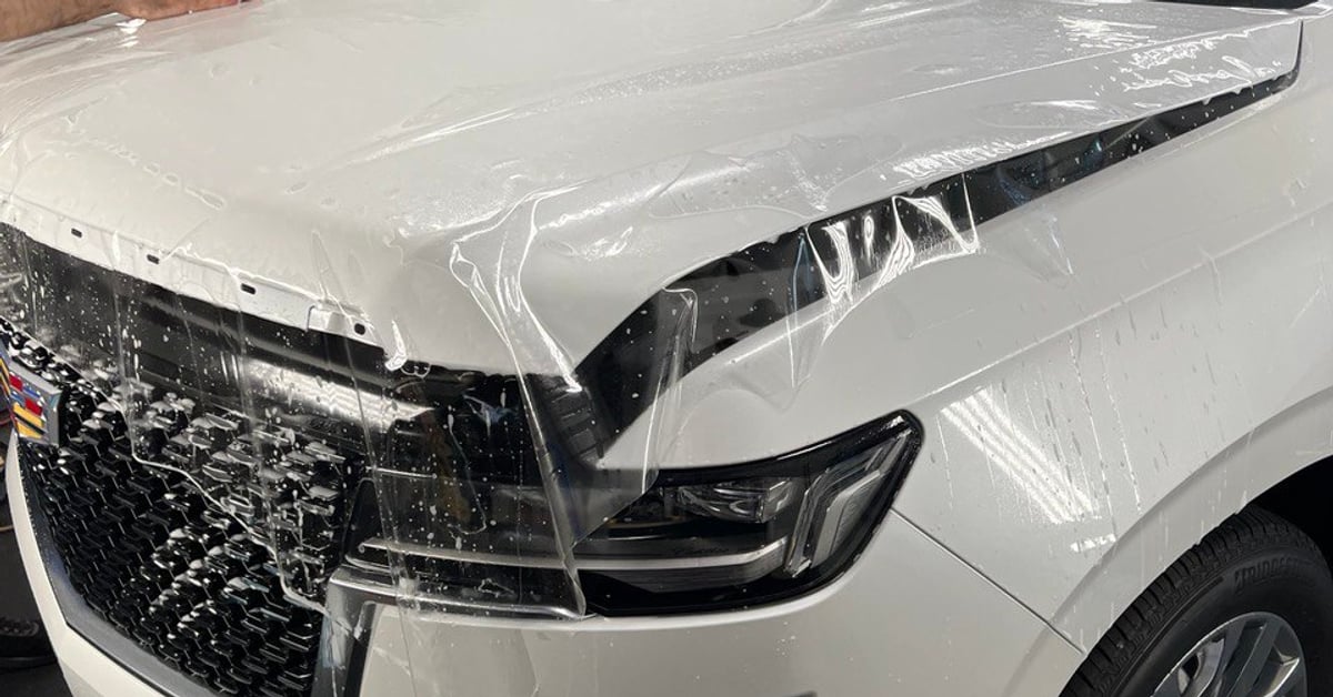 Technician applying clear paint protection film to a white Cadillac Escalade hood.